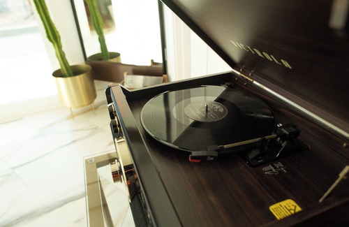 Welcome in the serenity of the desert by opening the modern folding door in the living room and inviting the outdoors in. Turn on the neon sign above the door to create a dreamy vibe and use the vintage-inspired record player to fill the house with music. The living room is also equipped with a 50 inch TV which is perfect for enjoying movies or an exciting game. You will also find a variety of board games to play during your stay.
