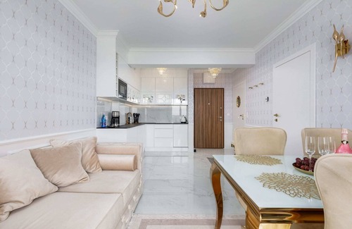 The fully equipped apartment can comfortably accommodate 4 people - perfect for a family holiday by the sea! The layout includes a living room with a seating area, a kitchen, a separate bedroom with a double bed and a private bathroom. The apartment is decorated in bright colors and comfortably furnished to create a homely and friendly atmosphere. Additional golden elements add a luxurious look to the interior. The lounge area has a large sofa and a flat-screen Tv, perfect for relaxing in the evening. There is also a balcony with garden furniture - the perfect place for a cup of morning coffee! The kitchen is equipped with all the necessary appliances for easy home cooking, such as a stovetop and a coffee maker. Other amenities include free Wi-Fi, a hairdryer and ironing facilities. Every stay starts with free toiletries, towels and linen.