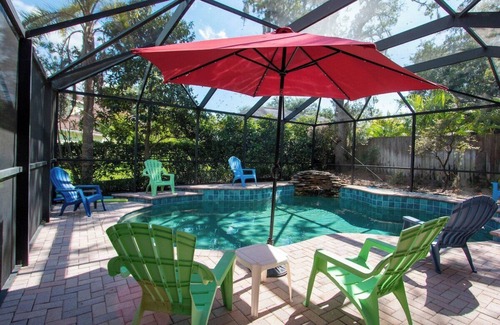 The house features a lush tropical garden and the fabulous screened free-form pool with a waterfall that sounds like a babbling brook in the woods.