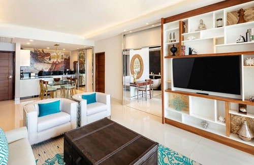 The contemporary design of the 1,313 square foot One Bedroom Suite incorporates a variety of textures and tones with the purpose of enriching the guest experience while living in the space. As you walk in, you will notice a stunning gourmet kitchen, complete with upscale appliances, a dining area that seats 4, and a living room with an entertainment center, a sleek 55-inch flat screen TV, a sofa bed, and two lounge chairs with the geometry of coral. Next to the kitchen, there is a full bathroom, as well as washer and dryer room for your convenience. Sleek sliding doors separate the bedroom from the spacious living area. The bedroom features a comfortable king-size bed with fluffy pillows to ensure your rest is as comfortable as possible. The en suite bathroom features a freestanding bathtub, a rain shower with a colorful mosaic shower seat, automated bidet toilet and double vanity with a backlit mirror. The large private terrace can be accessed from both the bedroom and the living room, and features stunning ocean and/or resort landscape views, a dining area, a hammock, and loveseat.