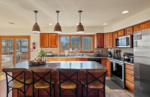 The dining room opens up directly to the panoramic outdoor deck with beautiful views of the lake. The deck is equipped for the ultimate grilling party! There is a large grill, outdoor table seating for the whole crew. An additional seating area is perfect for cozying up for a late-night glass of wine and chit-chat about all the day's activities.
