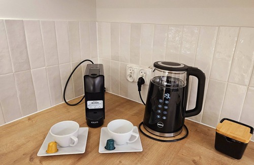 The fully equipped kitchen offers an induction hob, a fridge with freezer, a dishwasher, a capsule coffee machine (Espresso), and all necessary kitchenware. The bathroom includes a shower cabin and a hairdryer.