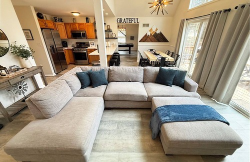 Nestled privately among scenic trails, Cozy Cove offers a serene setting surrounded by majestic trees, enhancing the beauty and privacy of your stay. At the heart of the house is the Great Room, a spacious and open-concept area designed for gathering and relaxation. This central space features a fully stocked kitchen with an L-shaped island and a counter bar that seats 4, a custom dining table that comfortably seats 8, and a cozy living area with soaring 20-foot vaulted ceilings, a gas-powered stone fireplace, and a striking stick-style chandelier that adds a touch of rustic elegance.