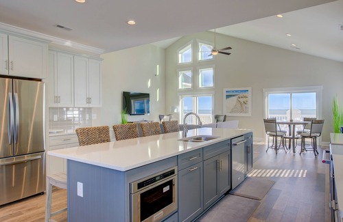 Cook your catch-of-the-day or Sunday breakfast from the kitchen, equipped with stainless steel appliances, tons of seating, and high ceilings, as you watch for the dolphins through the ocean-side sliding doors. Order pizza delivery or Instacart and stay in to watch movies or your favorite Netflix series, then rest on the lounge chairs and welcome nightfall. Sip wine or chamomile tea as you listen to the calming, nocturnal waves. Maybe you will seek a more peaceful view of the quiet sound side of the island on the rear decks of the home, or you may choose to catch some rays on the upper-level deck or lounge in the shade on the lower level and become lost in the views of the ocean. The private hot tub offers the perfect way to retreat beneath the starry sky.