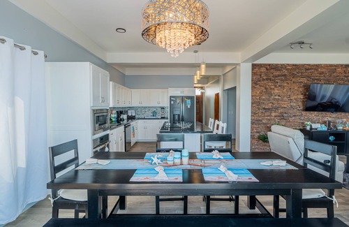 Inside your home away from home, cozy up and get comfortable on the oversized sofa in the living room. Here, you can simultaneously enjoy ocean views while watching your favorite TV shows and movies. The adjacent kitchen gleams with its stainless steel appliances and center island. Show off your culinary skills before serving up delicious dishes at the large dining table.