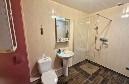 Enjoy a super-king-size bed in the stylishly decorated bedroom, equipped with its own TV. The adjoining walk-in wet room offers a spacious, colourful shower setup for convenience and style.