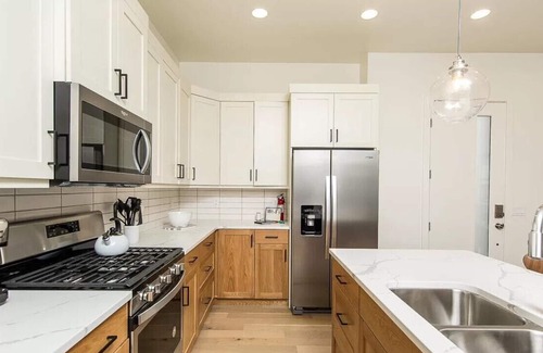 You will enjoy cooking and entertaining in this luxury kitchen. Featuring Stainless steel appliances as well as a side-by-side refrigerator, dishwasher, microwave, oven, and separate gas stovetop. The kitchen is fully stocked with a coffee pot, crockpot, blender, pancake grill, waffle maker, toaster, spices, and mixing bowls to enjoy baking. The kitchen area will seat 10. The living room has comfortable couches and a chair, and a large flat-screen TV. Also, enjoy a full-size washing and dryer. Also featuring a loft area with a couch, tv, and game area.